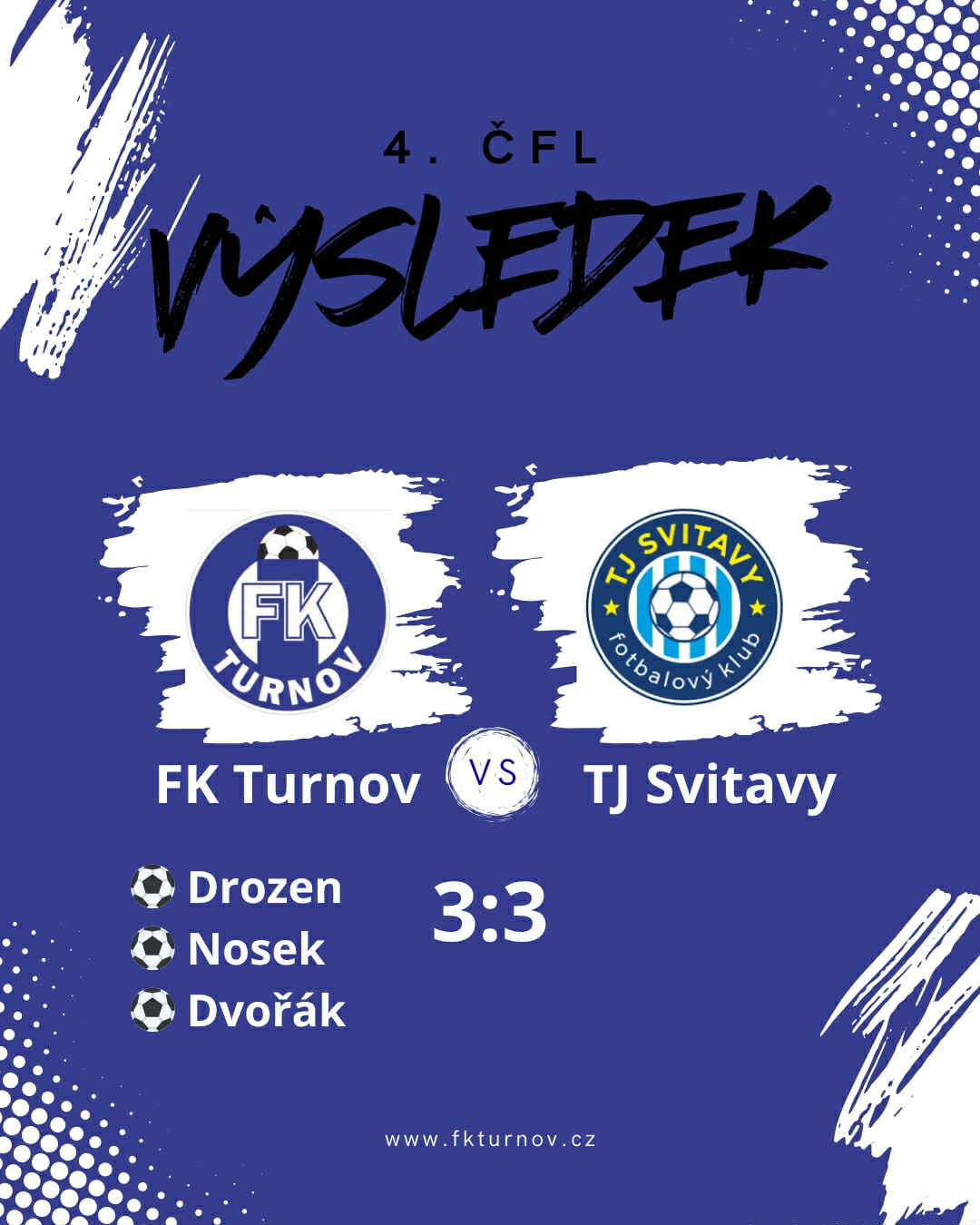 "S deštěm na turnovskou umělku za tratí padala také spousta gólů a bohužel pro domácí do obou branek. Hostům náramně vyšel vstup do utkání, protože Karmazína propálil už ve 3. minutě Řezník a po deseti minutách si to zopakoval – 0:2! K obratu zavelel Drozen a za čtvrthodinku to tam svitavském brankáři Jílkovi poslal i Nosek. Turnov měl rázem navrch, ale reklamovaná ruka ve vápně hostí se nepískala, a tak se šli hráči obou celků zahřát do kabin za smírného stavu. Druhý poločas začali lépe domácí, které poprvé v zápase poslal do vedení hlavičkou Dvořák. I přes několik slibných situací se Turnovským nepodařilo přidat pojistku a po zaváhání v obraně Svitavy vyrovnaly do prázdné branky Štarmanem. V 78. minutě pak sice viděl druhou žlutou a z toho pramenící červenou kartu jejich hráč Juřík, ale ani početní převaha FKT jednoho muže v poli na remíze nic nezměnila."