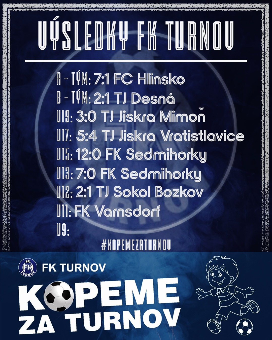 Starší žáci FK Turnov U15 předvedli v derby se sousedními Sedmihorkami naprosto dominantní výkon. Od úvodních minut bylo jasné, kdo bude na hřišti udávat tempo hry, a Turnovští se rychle ujali vedení, které postupně navyšovali až na konečných 12:0. Hosté z Turnova ukázali výbornou kombinační hru, důraz v osobních soubojích i chuť střílet góly. Dařilo se celému týmu, a i díky disciplinovanému výkonu v obraně udržel brankář čisté konto. Trenér mohl být po utkání s výkonem svých svěřenců maximálně spokojen – Turnov potvrdil svou formu a z derby si odváží nejen tři body, ale i pořádnou porci sebevědomí.