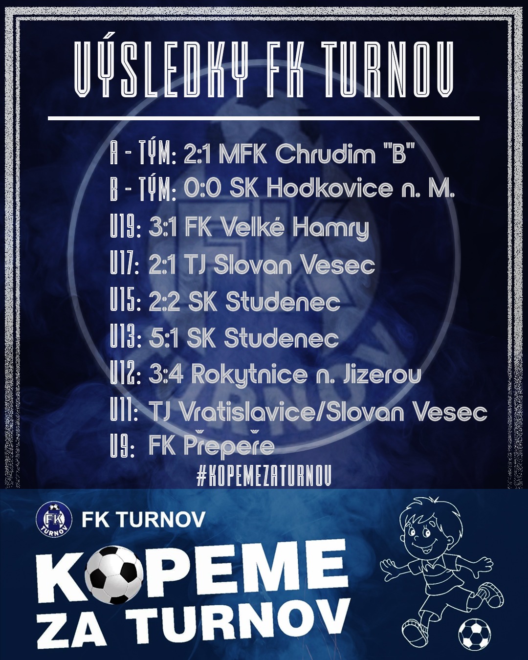 Mladší žáci FK Turnov U13 zajížděli k dalšímu utkání na hřiště SK Studenec, kde od prvních minut potvrzovali roli aktivnějšího týmu. Turnovští se rychle ujali kontroly nad míčem a určovali tempo hry, čímž soupeře dostávali pod neustálý tlak. Aktivní vstup do utkání přinesl své ovoce už v úvodu, kdy se Turnov dostal do vedení. Klid na kopačky přidal Lamač. Ještě do poločasu se prosadil také Goruk. Hosté tak šli do kabin s komfortním vedením a jasně měli zápas pod kontrolou. Hra domácího celku byla po většinu utkání založená především na dlouhých nákopech za obranu Turnova. S tím si však obranná linie hostů dokázala poradit velmi dobře a až na jednu výjimku soupeři výraznější šanci nepovolila. Ve druhém poločase Turnov pokračoval v dominantním výkonu a dokázal přidat ještě tři branky. Jednou sice inkasoval, ale to nic nezměnilo na celkovém obrazu hry. Turnov si tak díky kvalitnímu a soustředěnému výkonu odvezl zasloužené vítězství.