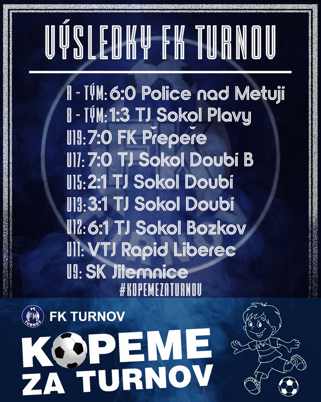 V neděli sehráli mladší dorostenci FK Turnov U15 náročné utkání na hřišti TJ Sokol Doubí, které do té doby procházelo soutěží bez ztráty bodu. Po velmi vyrovnaném a bojovném souboji si však Turnov odvezl vítězství 2:1. Zápas se od úvodních minut hrál ve vysokém tempu. Oba celky předváděly pohledné akce, které často dokázaly překonat obranné řady soupeře. Po hodině hry se hosté z Turnova prosadili podruhé a šli do vedení 2:0, na které krátce poté domácí Doubí okamžitě odpovědělo a snížilo na 1:2. Závěrečná půlhodina přinesla velký tlak domácích, kteří se snažili o vyrovnání. Turnovská obrana však pracovala velmi obětavě a s přehledem odolala. Díky disciplinovanému výkonu a kompaktní defenzivě si hosté pohlídali nejtěsnější náskok a po závěrečném hvizdu mohli slavit cenný skalp dosud stoprocentního soupeře.